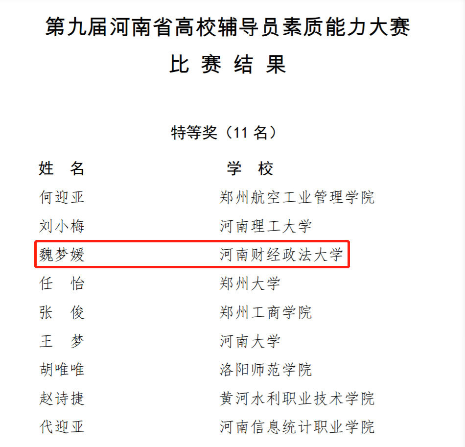 4月27日至5月11日,由省委教育工委、省教育厅主办的第九届河南省高校辅导员素质能力大赛圆满结束。经过三轮激烈角逐,我校经济学院辅导员魏梦媛脱颖而出,以总成绩全省第三的排名获得特等奖。