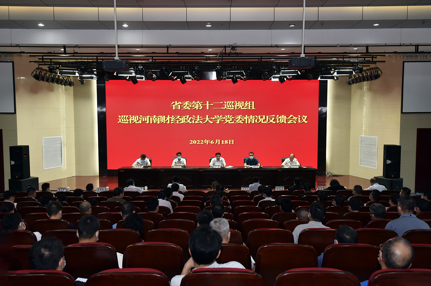 6月18日下午,省委第十二巡视组巡视河南财经政法大学党委情况反馈会议召开。会前,省委第十二巡视组组长唐玉宏主持召开向河南财经政法大学党委书记杨宏志的情况反馈会,通报巡视发现的主要问题。会上,唐玉宏反馈了巡视情况,省纪委常委、省委巡视办主任王毅代表省委巡视工作领导小组就整改工作提出要求,杨宏志主持会议并表态。